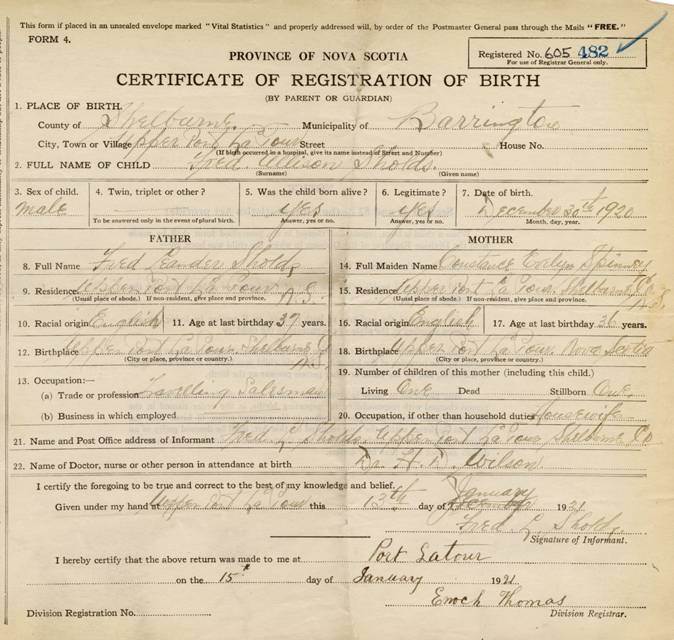 21. Name and Post Office address of Informant Fred L. Sholds Upper Port La Tour, Shelburne Co.