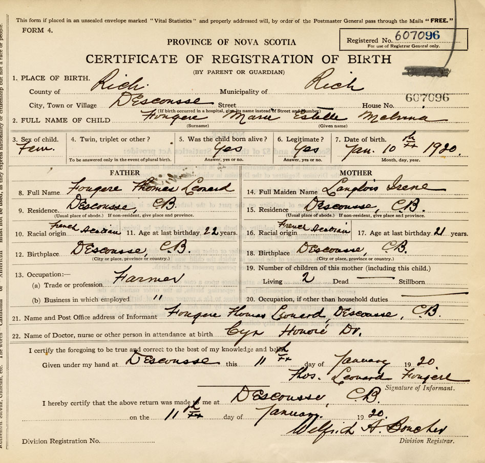 10. Racial Origin French Acadian | 11. Age at last birthday 22