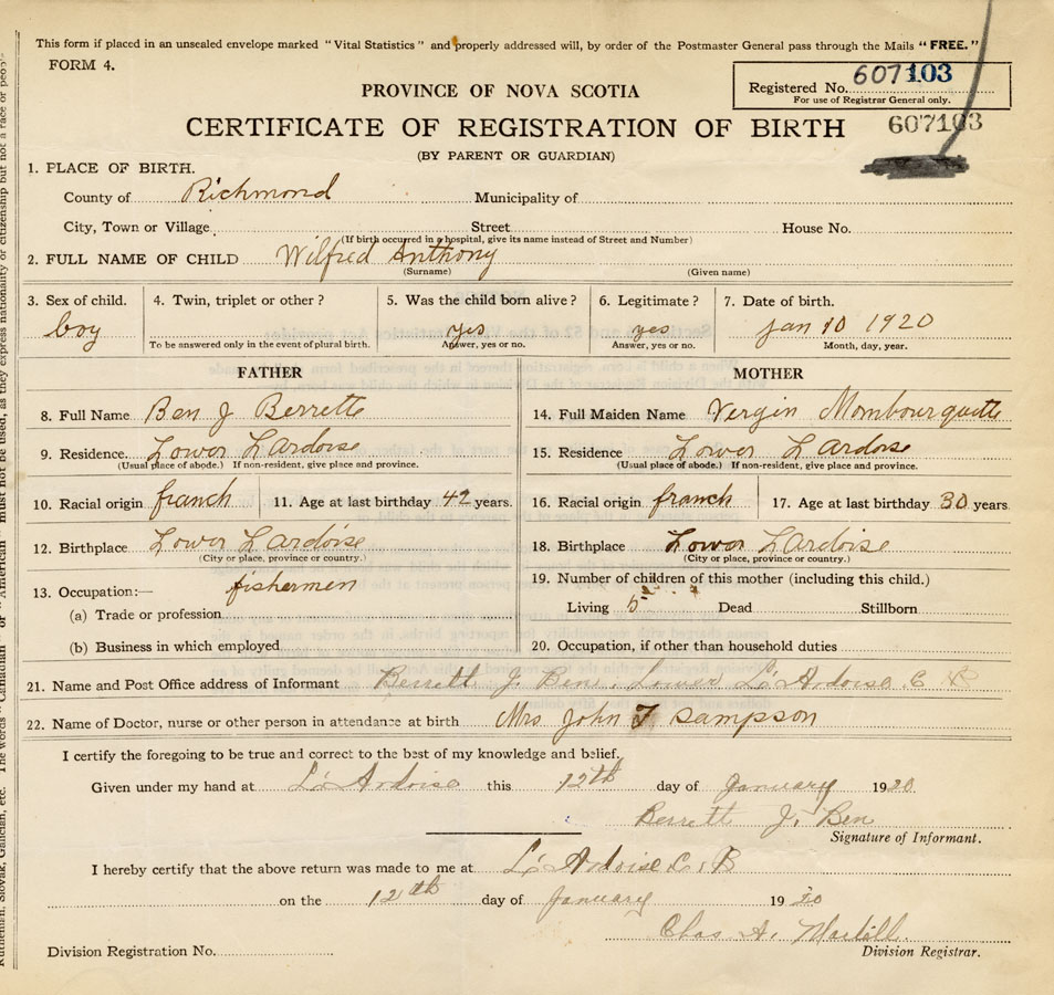 21. Name and Post Office address of Informant Ben J. Berrette Lower L'Ardoise