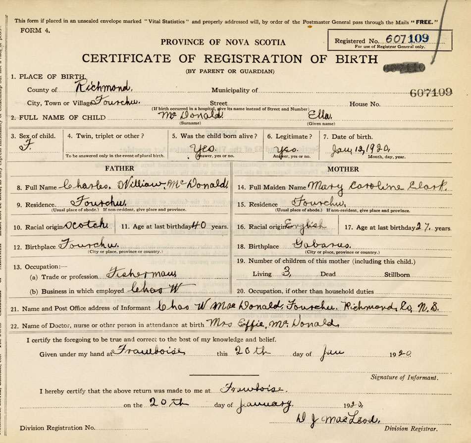 21. Name and Post Office address of Informant Chas. W. MacDonald Fourchu, Richmond Co.