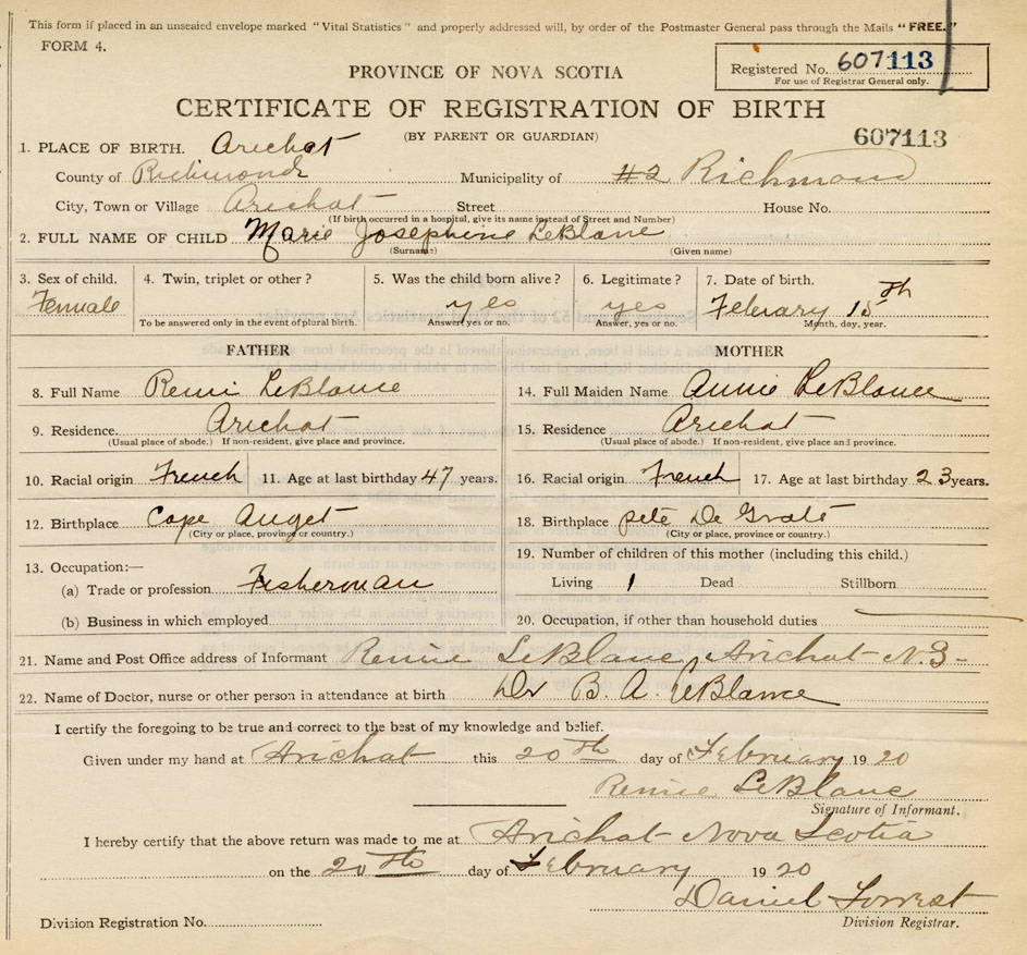 21. Name and Post Office address of Informant Annie LeBlanc Arichat