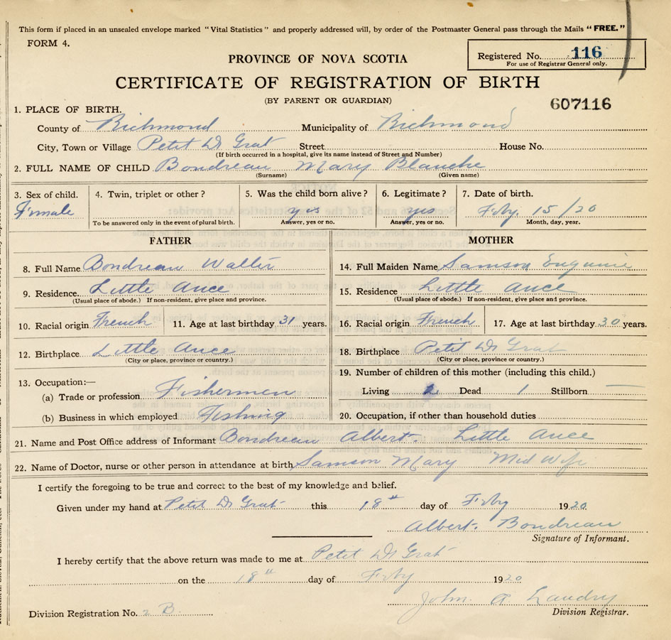 21. Name and Post Office address of Informant Albert Boudreau Little Ance
