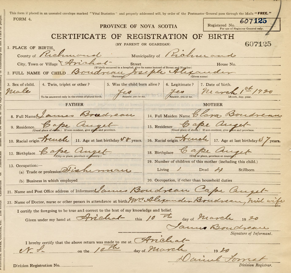 22. Name of Doctor, nurse or other person in attendance at birth Mrs. Alexander Boudreau, midwife