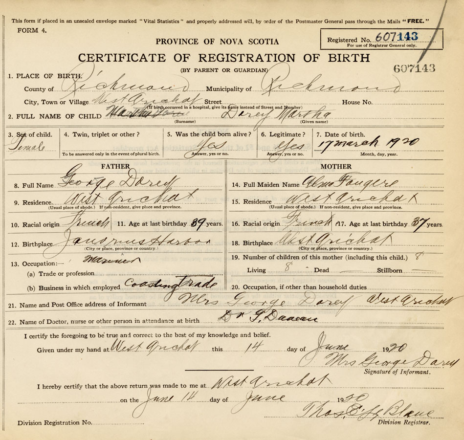 21. Name and Post Office address of Informant Mrs. George Dorey West Arichat