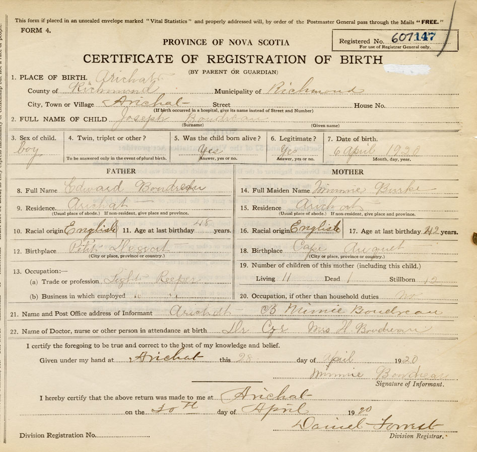 21. Name and Post Office address of Informant Minnie Boudreau Arichat