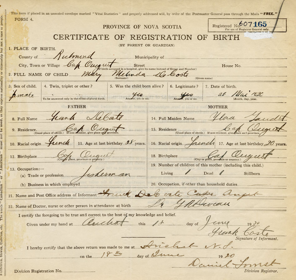 21. Name and Post Office address of Informant Frank DeCoste Cape Auguet