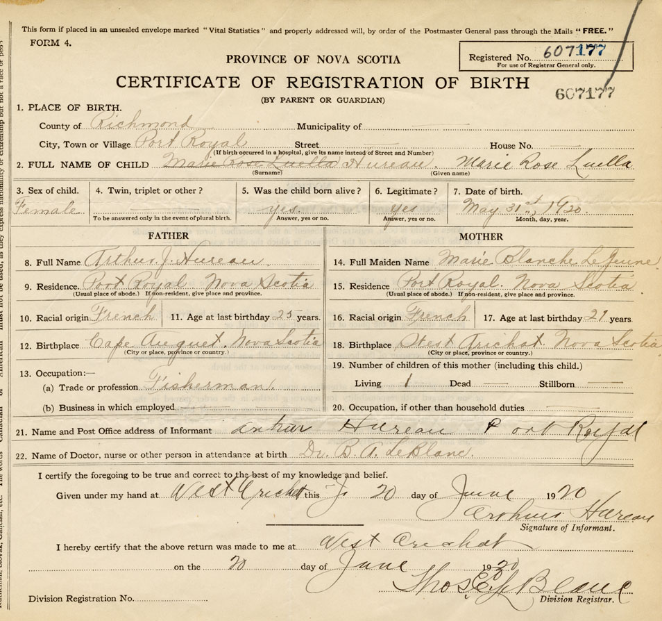 22. Name of Doctor, nurse or other person in attendance at birth Dr. B. A. LeBlanc
