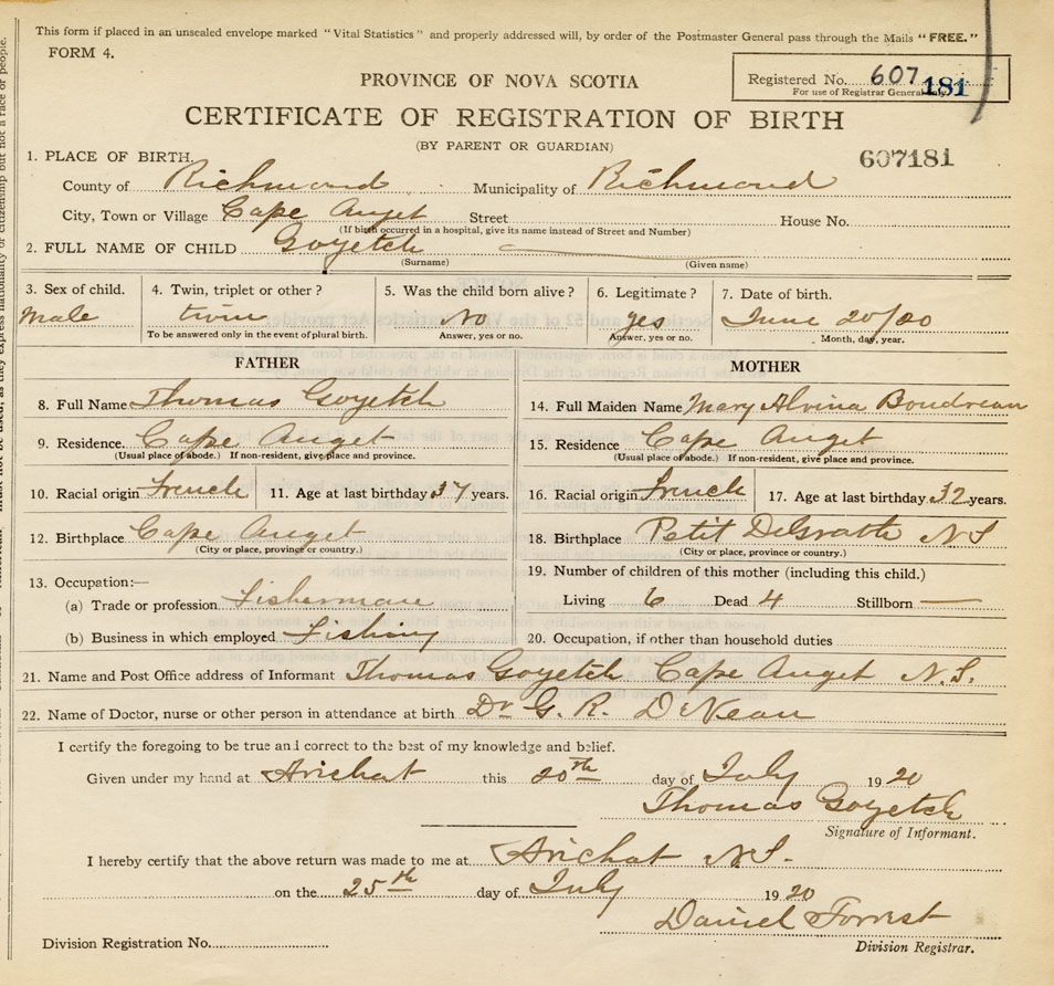 21. Name and Post Office address of Informant Thomas Goyetch Arichat