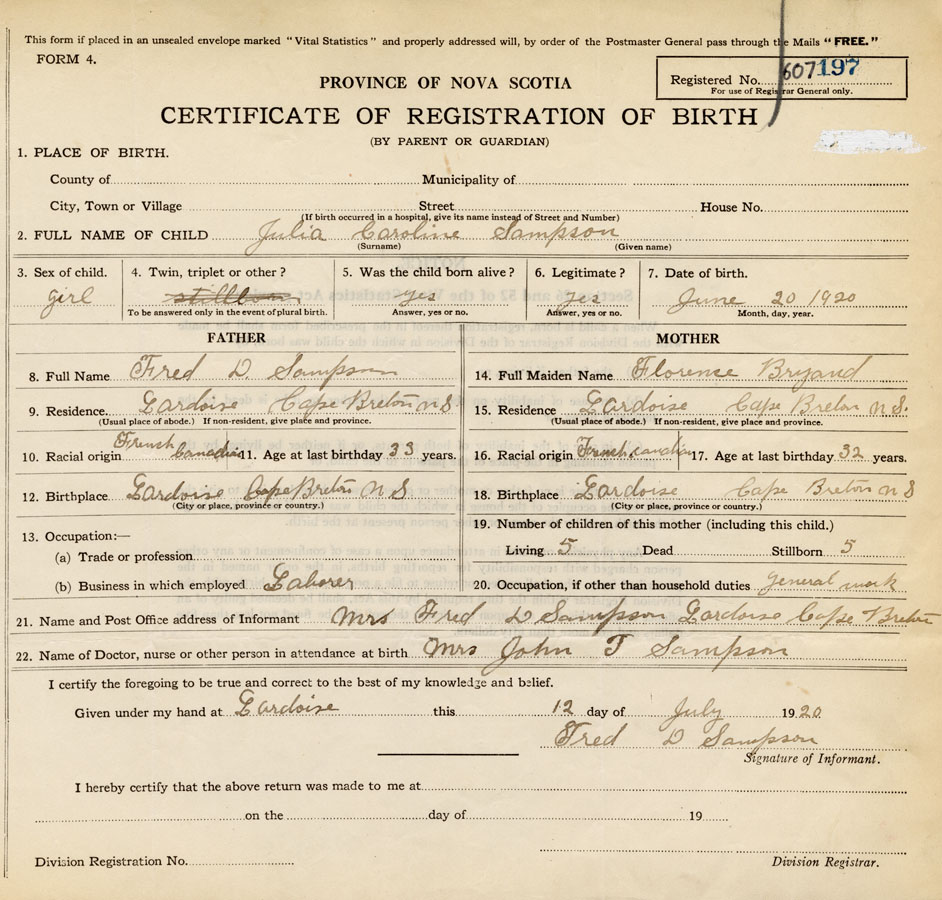 21. Name and Post Office address of Informant Fred D. Sampson L'Ardoise, Cape Breton