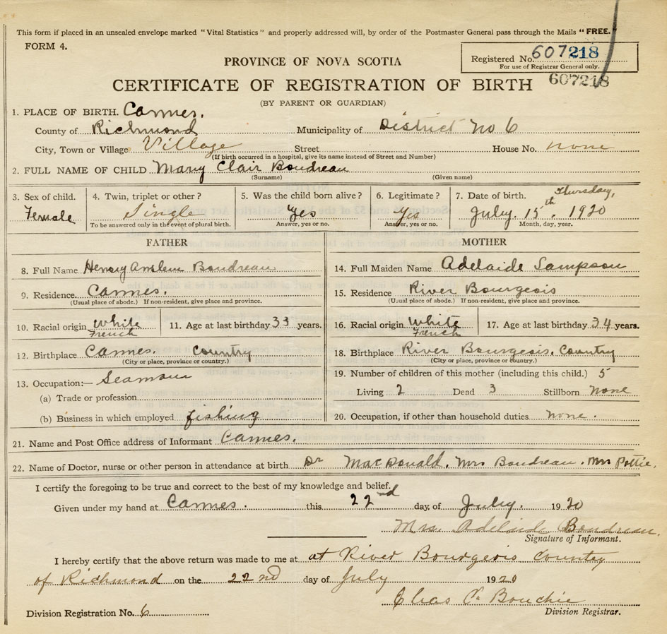 22. Name of Doctor, nurse or other person in attendance at birth Dr. MacDonald, Mrs Boudreau, Mrs Pottie