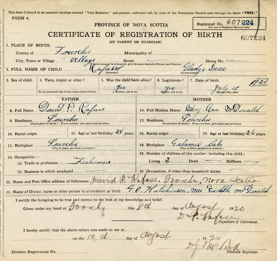 2. FULL NAME OF CHILD Rafuse, Gladys Irene
