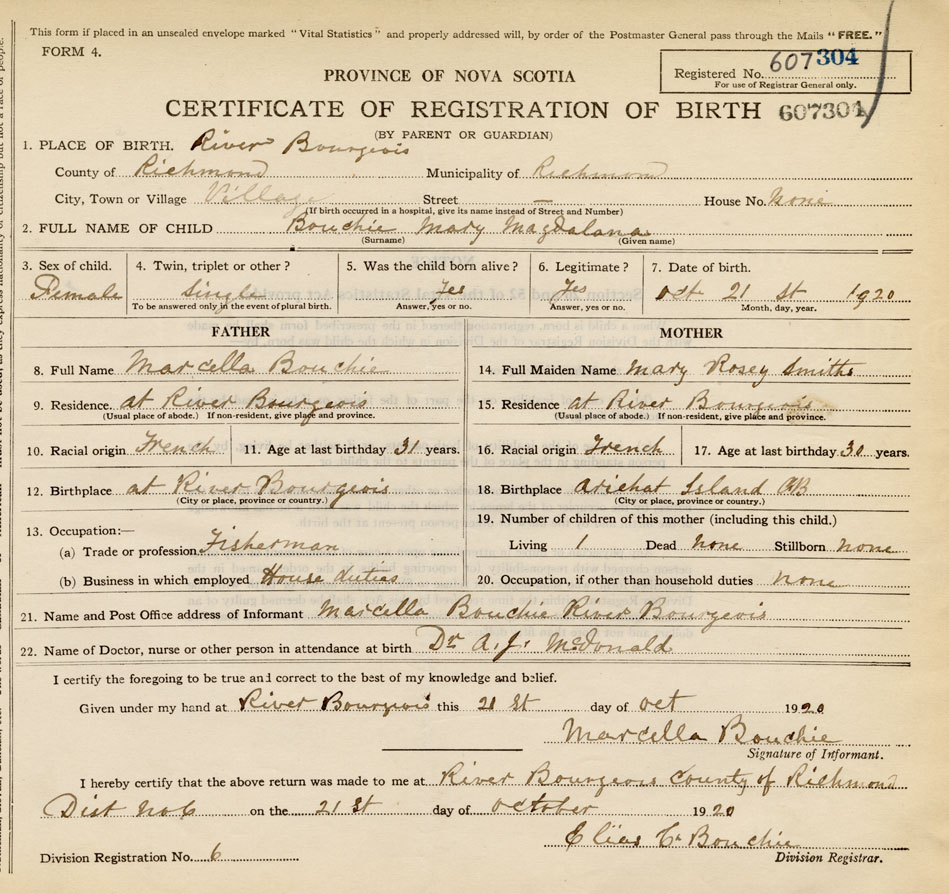 21. Name and Post Office address of Informant Marcella Bouchie River Bourgeois