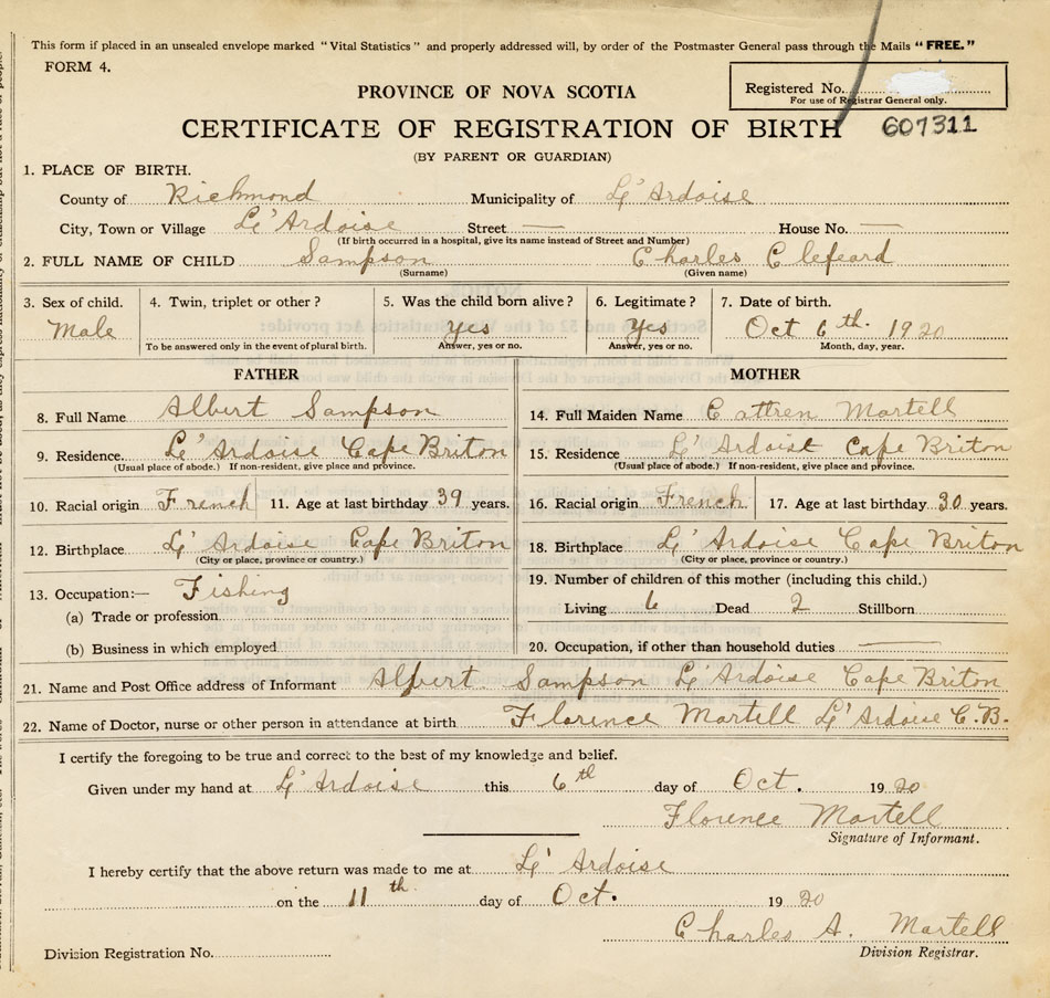 21. Name and Post Office address of Informant Florence Martell L'Ardoise, Cape Breton