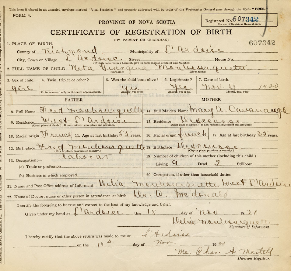 21. Name and Post Office address of Informant Delia Mombourquette West L'Ardoise