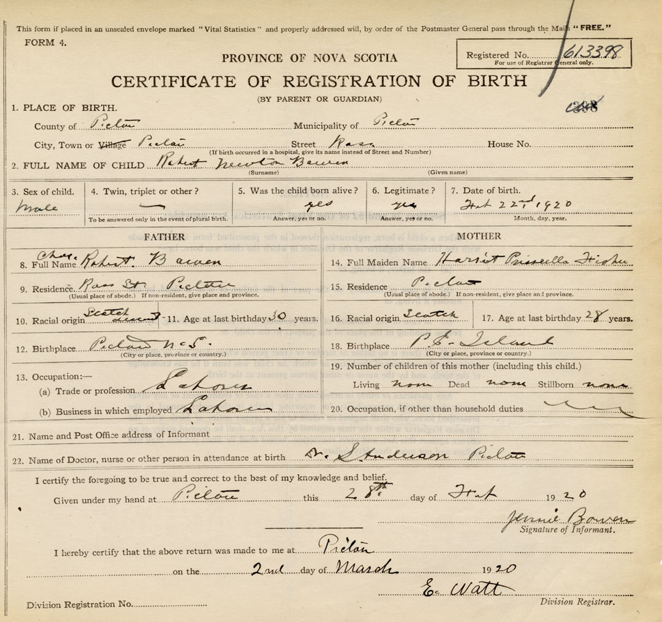 22. Name of Doctor, nurse or other person in attendance at birth Dr. S. Anderson, Pictou