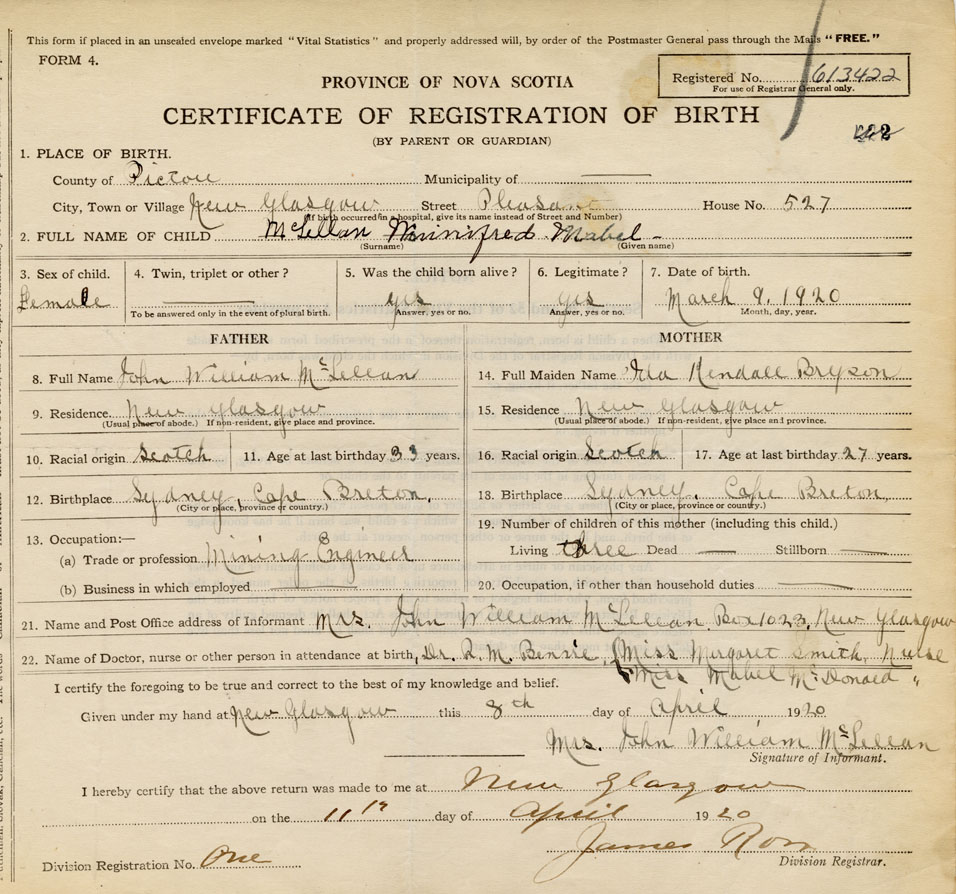 21. Name and Post Office address of Informant Mrs. John William McLellan Box 1023, New Glasgow