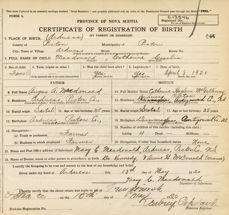 21. Name and Post Office address of Informant Mary C. MadDonald Ardness, Pictou Co.