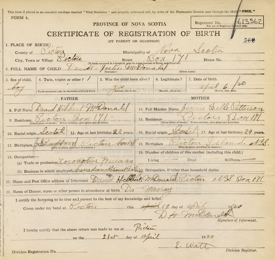 21. Name and Post Office address of Informant David Hilbert McDonald Pictou NS Box 171