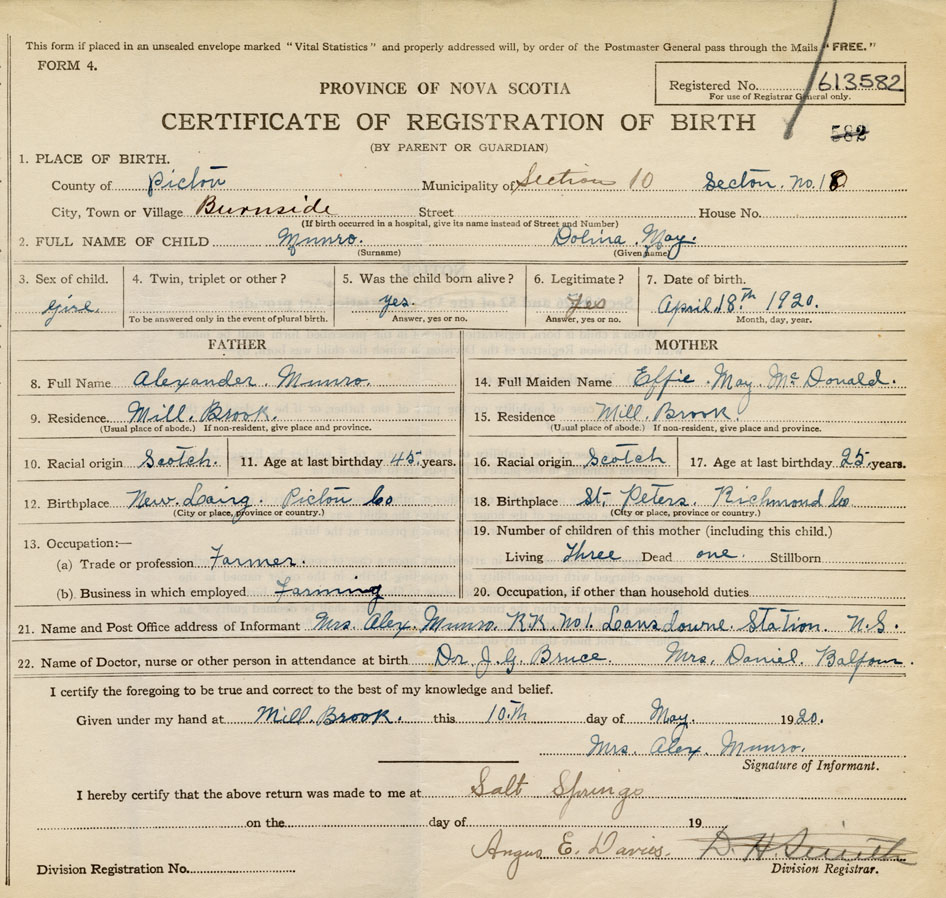 21. Name and Post Office address of Informant Mrs. Alex Munro RR No1, Lansdowne Station