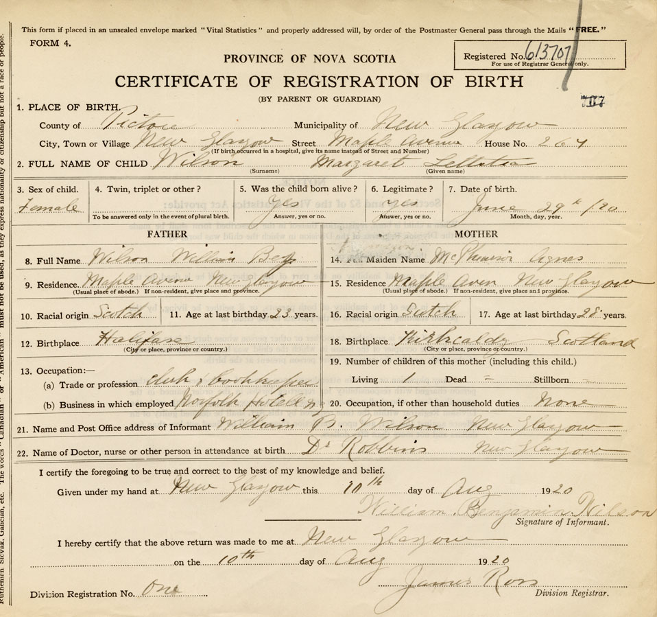 22. Name of Doctor, nurse or other person in attendance at birth Dr Robbins, New Glasgow