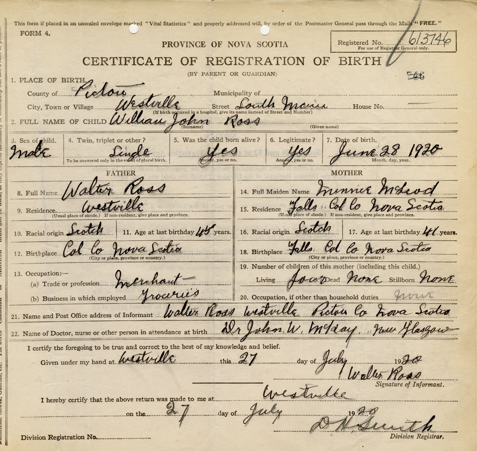 22. Name of Doctor, nurse or other person in attendance at birth Dr. John W. McKay, New Glasgow