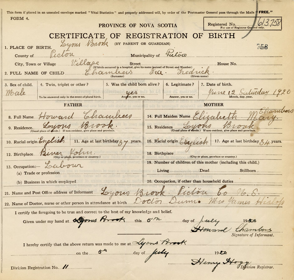 21. Name and Post Office address of Informant Howard Chambers Lyons Brook, Pictou Co.