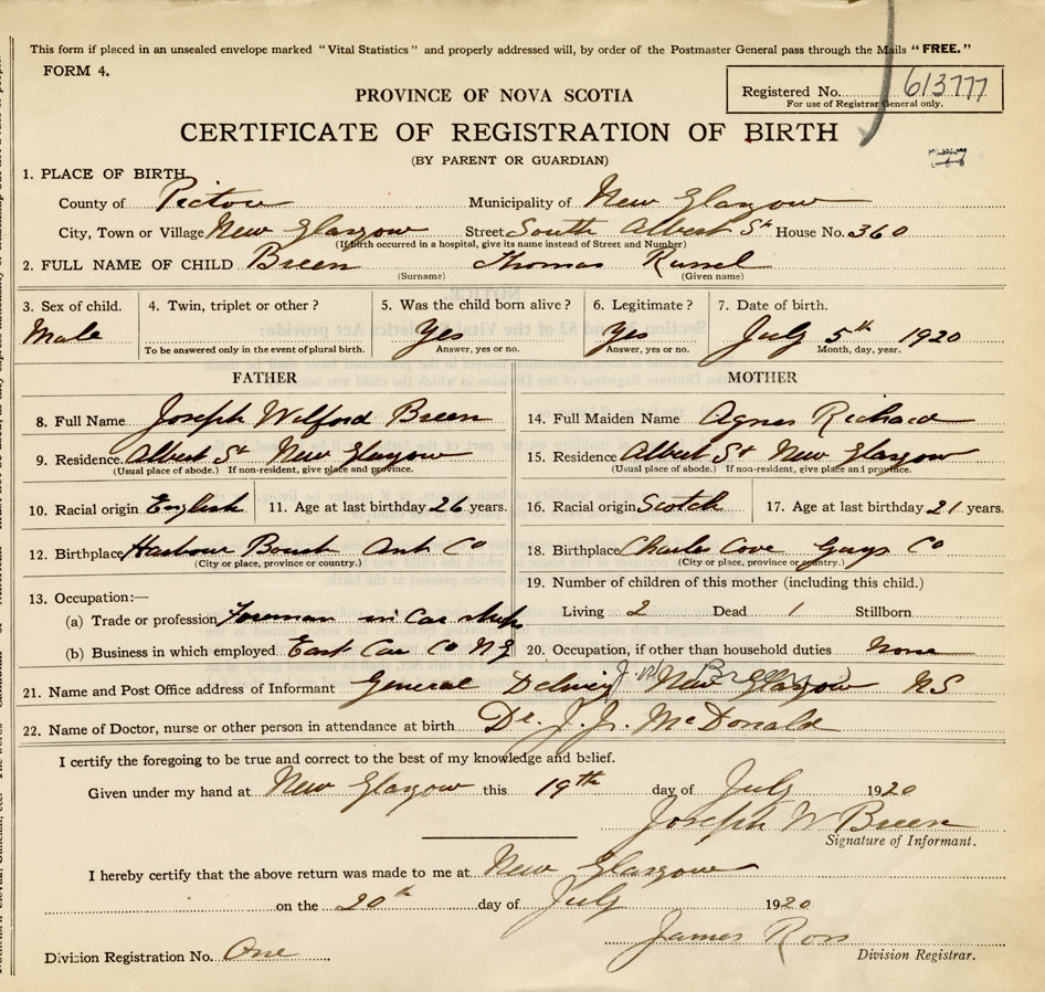 21. Name and Post Office address of Informant Joseph W. Breen General Delivery, New Glasgow, N.S