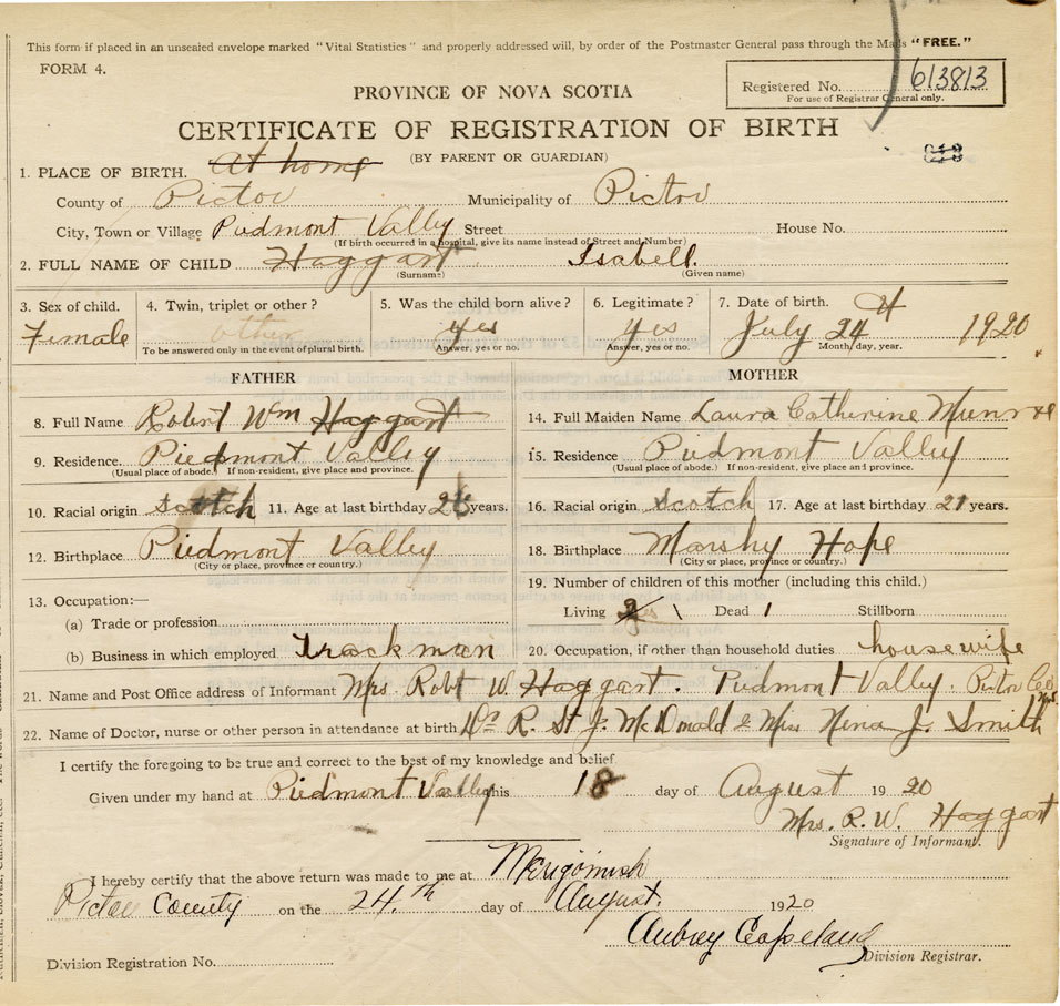21. Name and Post Office address of Informant Mrs. R. W. Haggart Piedmont Valley, Pictou Co.
