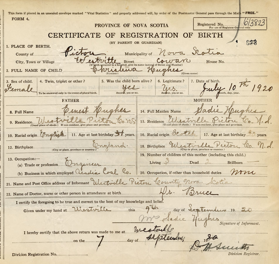 21. Name and Post Office address of Informant Mrs. Sadie Hughes Westville, Pictou County
