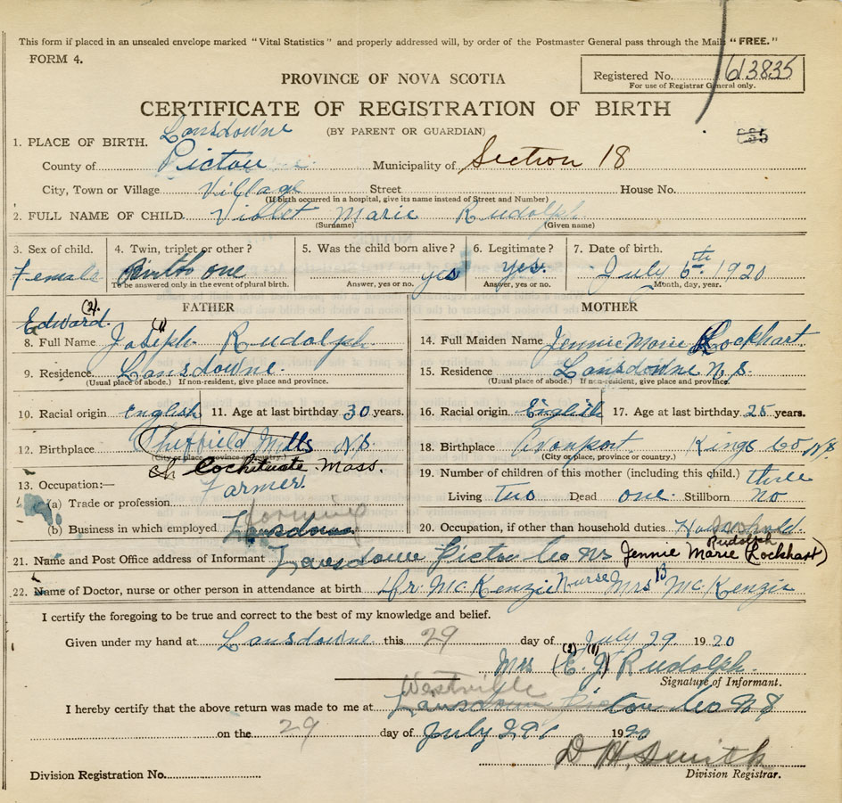 21. Name and Post Office address of Informant Jennie Marie (Lockhart) Rudolph Lansdowne, Pictou Co.