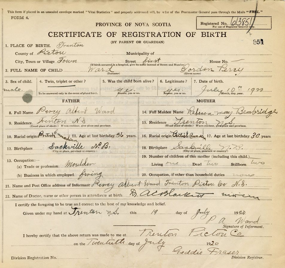 21. Name and Post Office address of Informant Percy Albert Ward Trenton, Pictou Co.