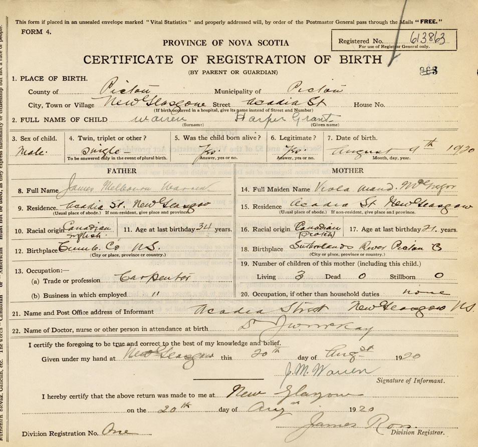21. Name and Post Office address of Informant J. M. Warren Acadia Street New Glasgow N.S.