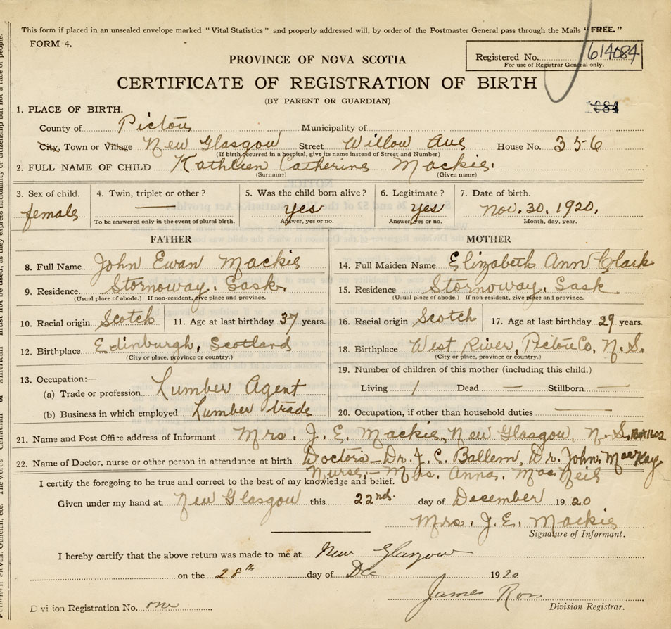 21. Name and Post Office address of Informant Mrs. J. E. Mackie New Glasgow
