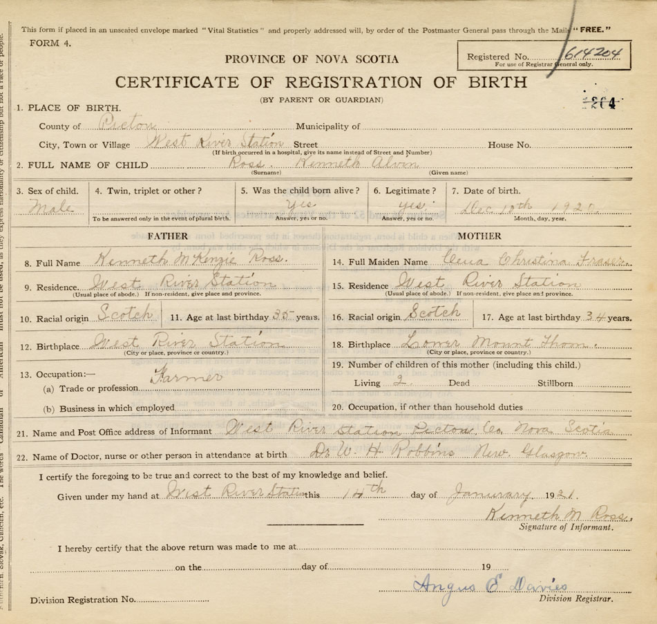 21. Name and Post Office address of Informant Kenneth M. Ross West River Station, Pictou Co.