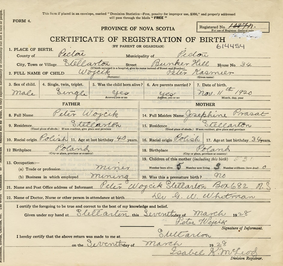 21. Name and Post Office address of Informant Peter Wojcik Stellarton, Box 682