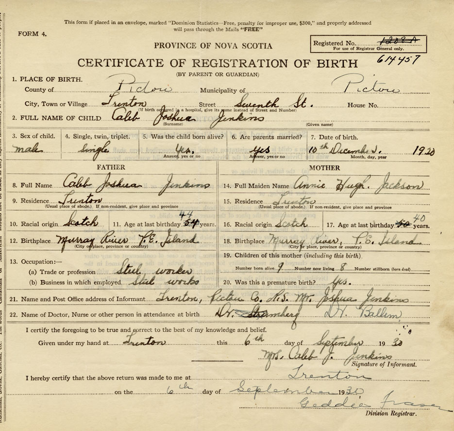 21. Name and Post Office address of Informant Mrs. Caleb J. Jenkins Trenton, Pictou Co.