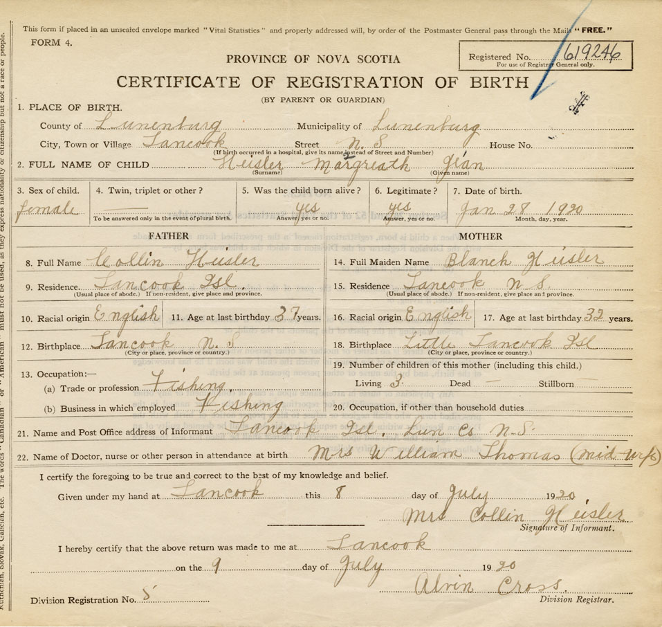 21. Name and Post Office address of Informant Mrs. Collin Heisler Tancook Island, Lunenburg County