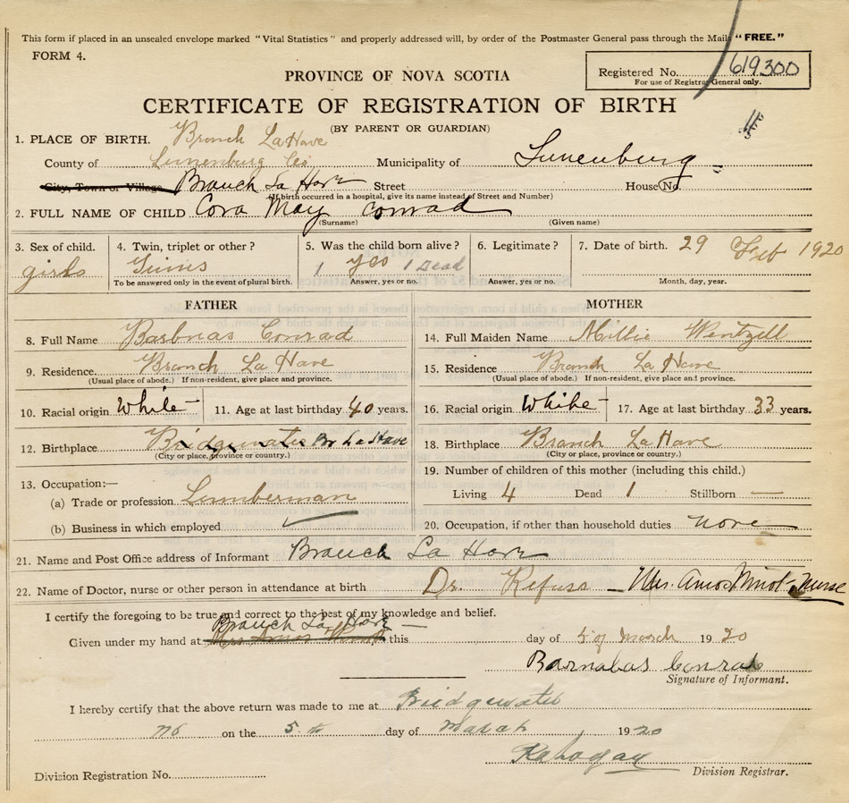 21. Name and Post Office address of Informant Barnabas Conrad Branch LaHave