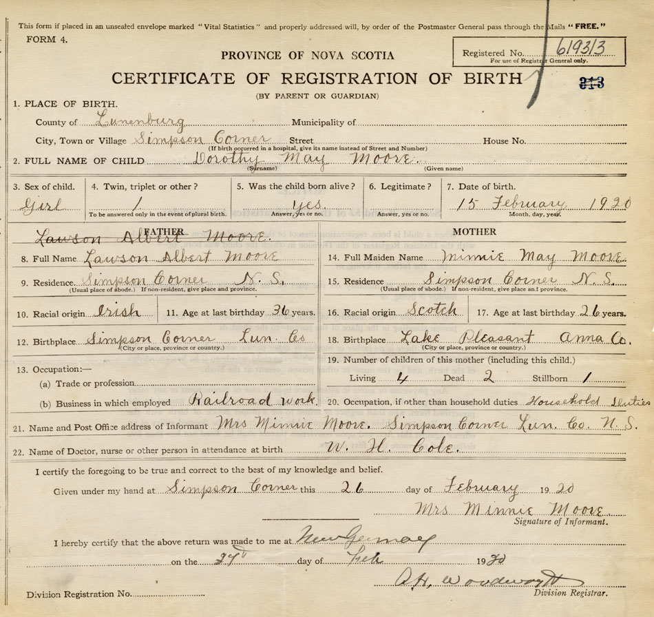 21. Name and Post Office address of Informant Mrs. Minnie Moore Simpson Corner Lun. Co. N.S.