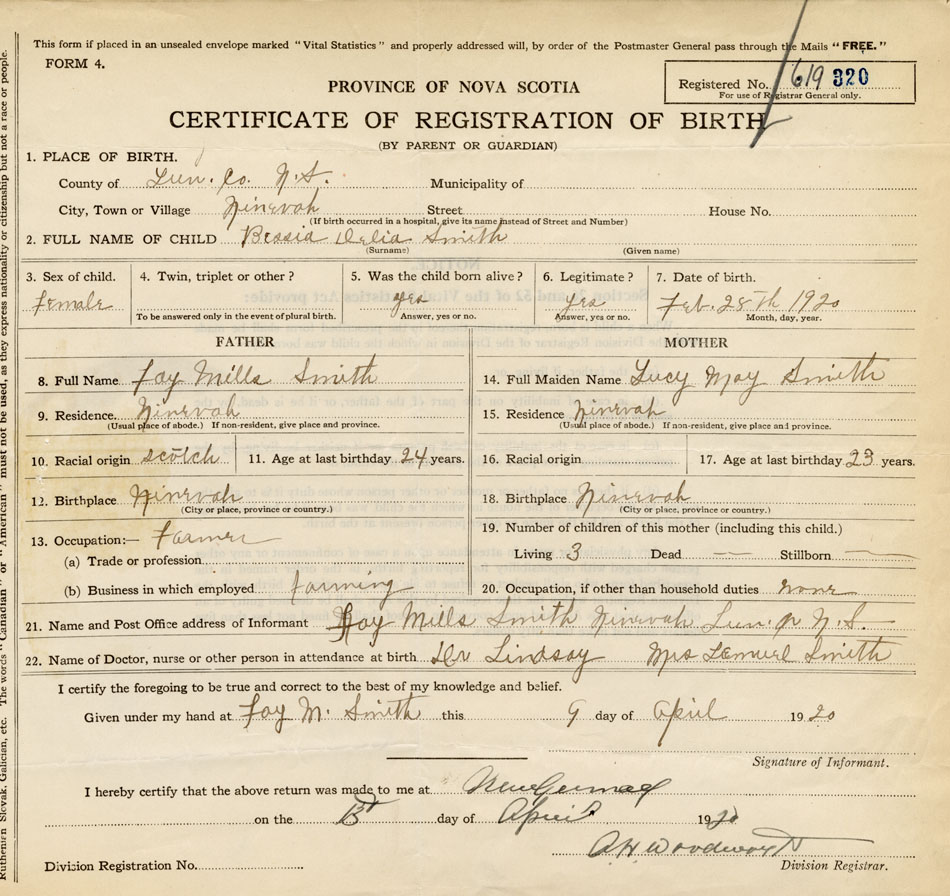 21. Name and Post Office address of Informant Fay Mills Smith Nineveh Lun. Co N.S.
