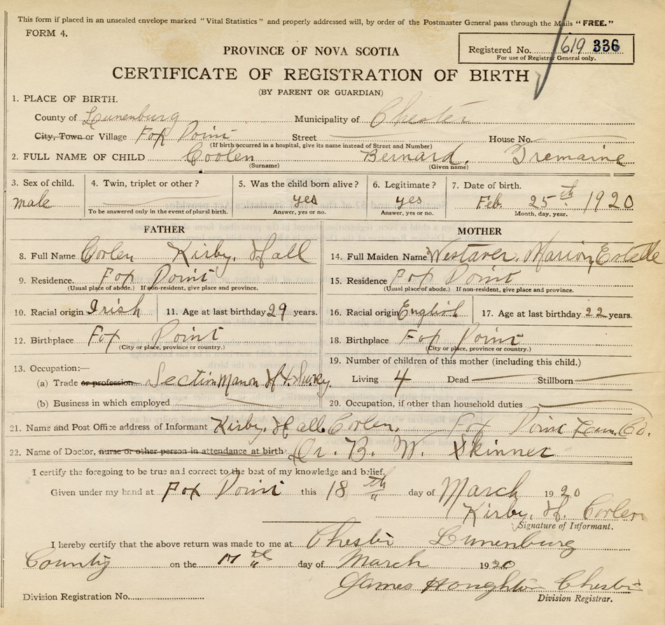 21. Name and Post Office address of Informant Kirby Hall Coolen Fox Point, Lunenburg Co.
