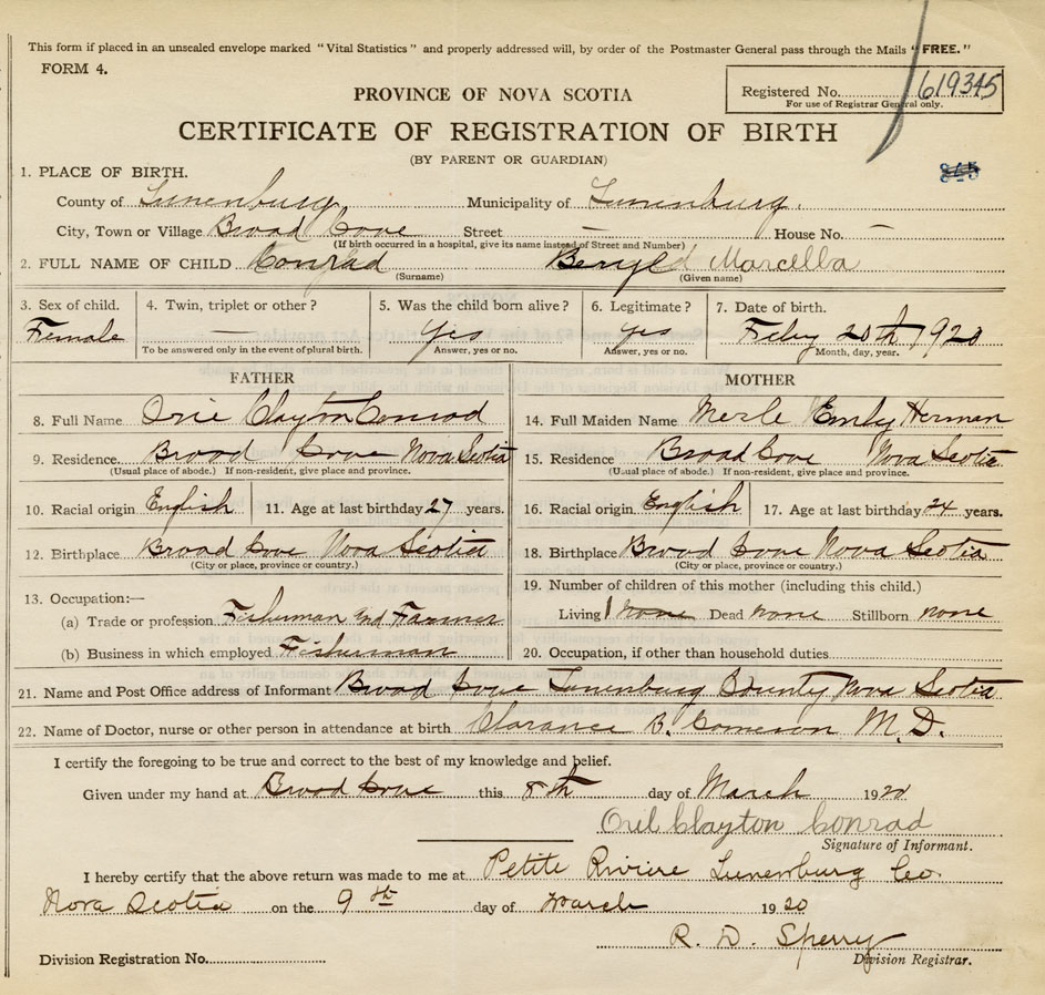 21. Name and Post Office address of Informant Oril Clayton Conrad Broad Cove Lunenburg County NS