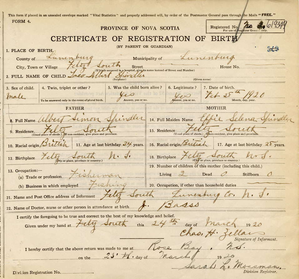 21. Name and Post Office address of Informant Chas H. Zeller Feltzen South, Lunenburg Co. N.S.