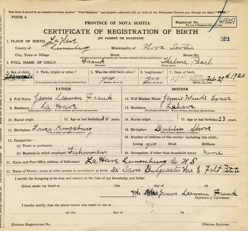 21. Name and Post Office address of Informant James Leaman Frank La Have, Lunenburg Co.
