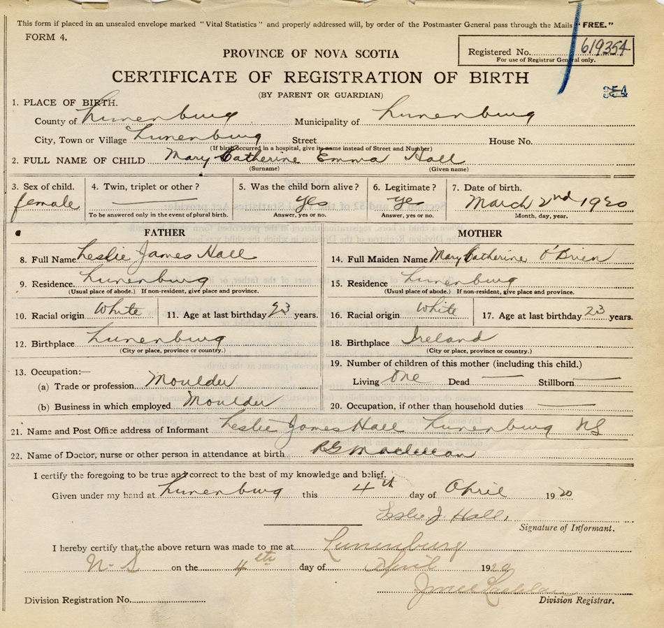 21. Name and Post Office address of Informant Leslie James Hall Lunenburg N.S.