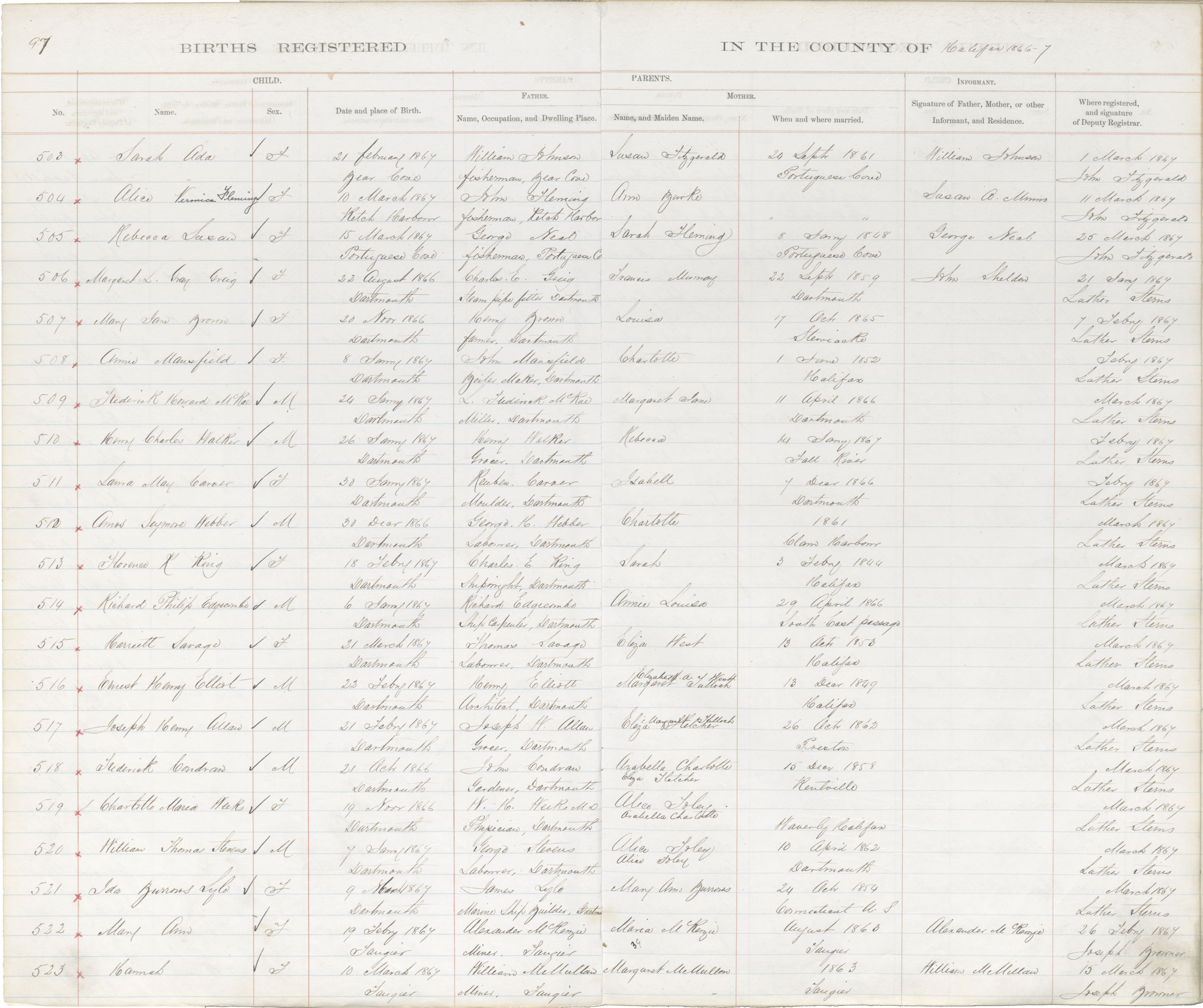 Birth Registration: Year: 1867 book: 1809 page: 97 number: 523