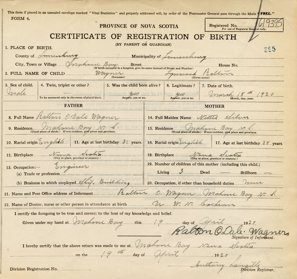 21. Name and Post Office address of Informant Ralton O. Wagner Mahone Bay N.S.