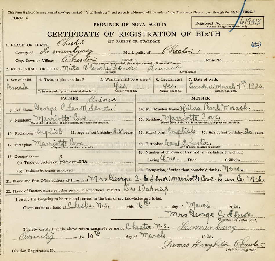 21. Name and Post Office address of Informant Mrs. George C. Eisner Marriotts Cove, Lunenburg Co.