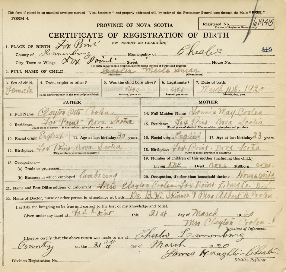 21. Name and Post Office address of Informant Mrs. Clayton Coolen Fox Point, Lunenburg Co