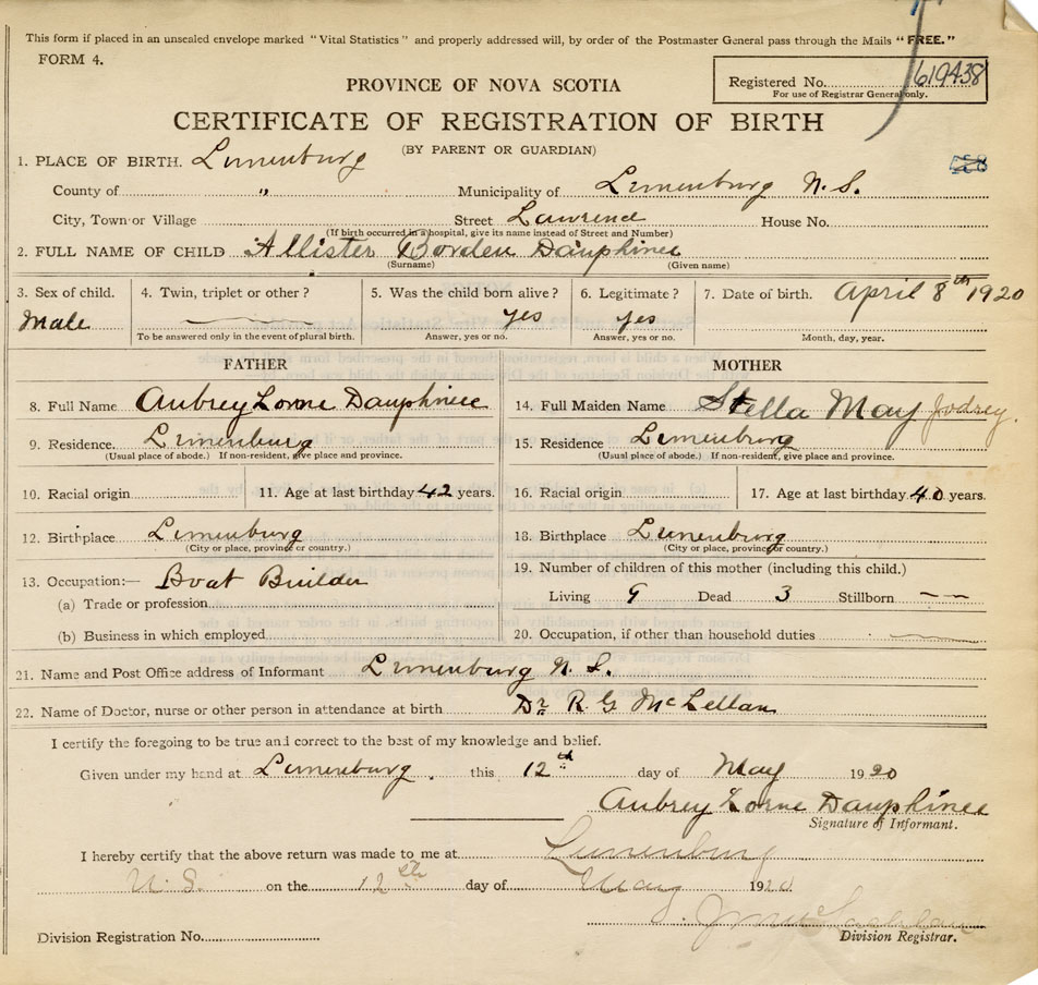 21. Name and Post Office address of Informant Aubrey Lorne Dauphinee Lunenburg